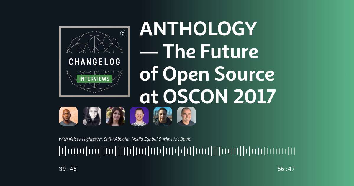 This is an anthology episode from OSCON 2017 featuring awesome conversations with Kelsey Hightower (OSCON Co-Chair and Developer Advocate at Google Cloud Platform), Safia Abdalla (Open Source Developer and Creator of Zarf), and Mike McQuaid and Nadia Eghbal (GitHub Open Source Programs).