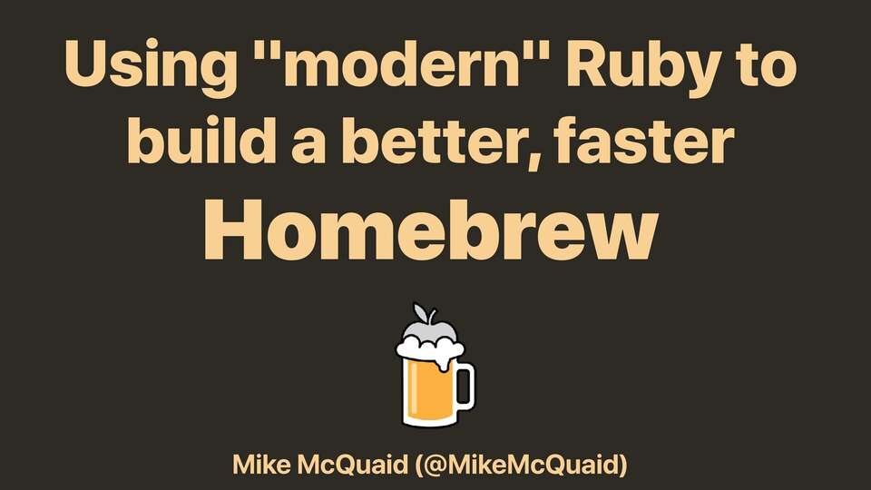 - 0:44 So today I'm going to talk about using modern Ruby in homebrew to build a better, faster homebrew. First, some